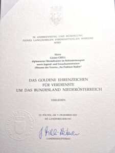 In Anerkennung und Würdigung seines langjährigen verdienstvollen Wirkens wurde unserem Obmann Günter Grill von Landeshauptfrau Mag. Johanna Mikl-Leitner am 09.12.25 das Goldene Ehrenzeichen für Verdienste um das Bundesland NÖ verliehen.